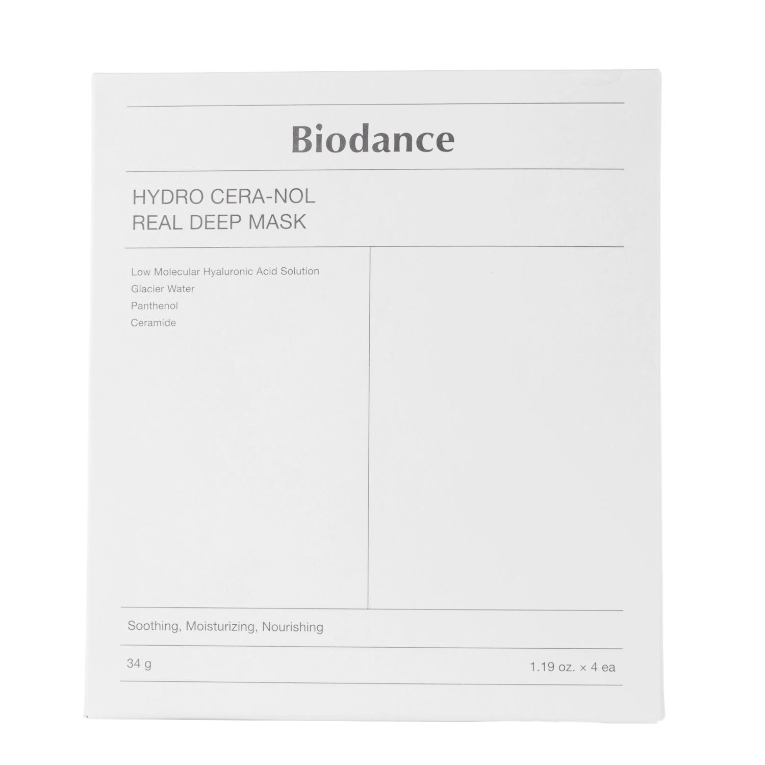 Biodance - Hydro Cera-nol Real Deep Mask Set - a set of 4 hydrogel face masks. They have a two-part form (for the lower and upper part of the face). They are designed to be used all night or a minimum of 3-4 hours to deeply moisturize the skin and improve its elasticity. They contain a composition of ingredients with soothing andhydrating effects. Their formula includes water-binding low-molecular hyaluronic acid and panthenol, which promotes regeneration and soothes irritation. The ceramides used strengthens the hydrolipid barrier, while glacier water soothes and restores softness. After the active essence is absorbed into the skin, the mask becomes transparent.
